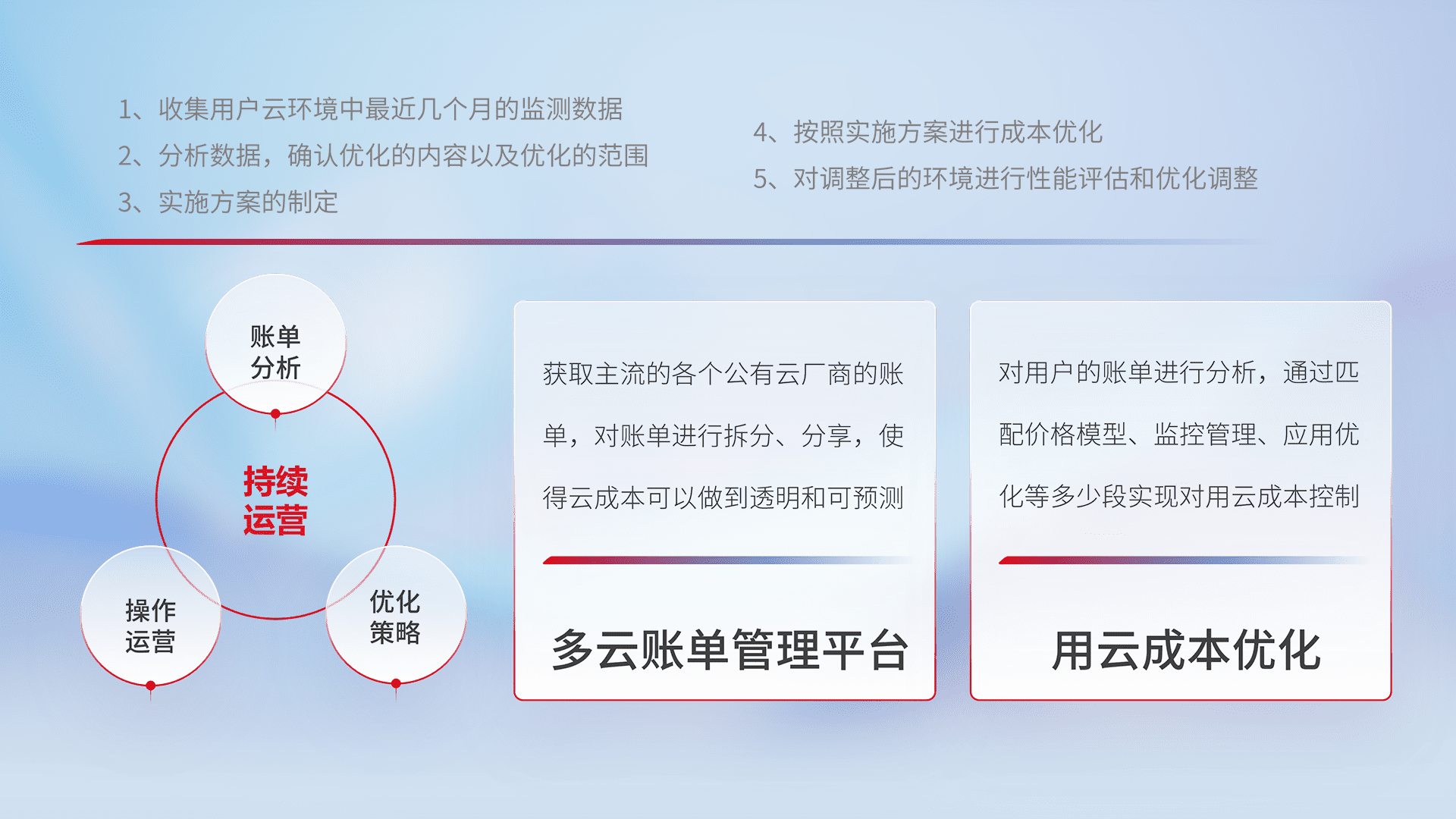 通过多云纳管,,以统一的资源数据模型把客户的云资源进行抽象和封装,,进而实现对多云资源的统一操作,,,,保障云资源管理的可靠性、、、、稳定性与可用性。。。量身定制化运维内容,,,配置、、开发运维、、、、补丁管理、、、备份、、、监控、、、、认证和访问管理、、、、审计和日常巡检等,,,保障在用云过程中的可靠度,,,,稳定度以及高可用率。。。