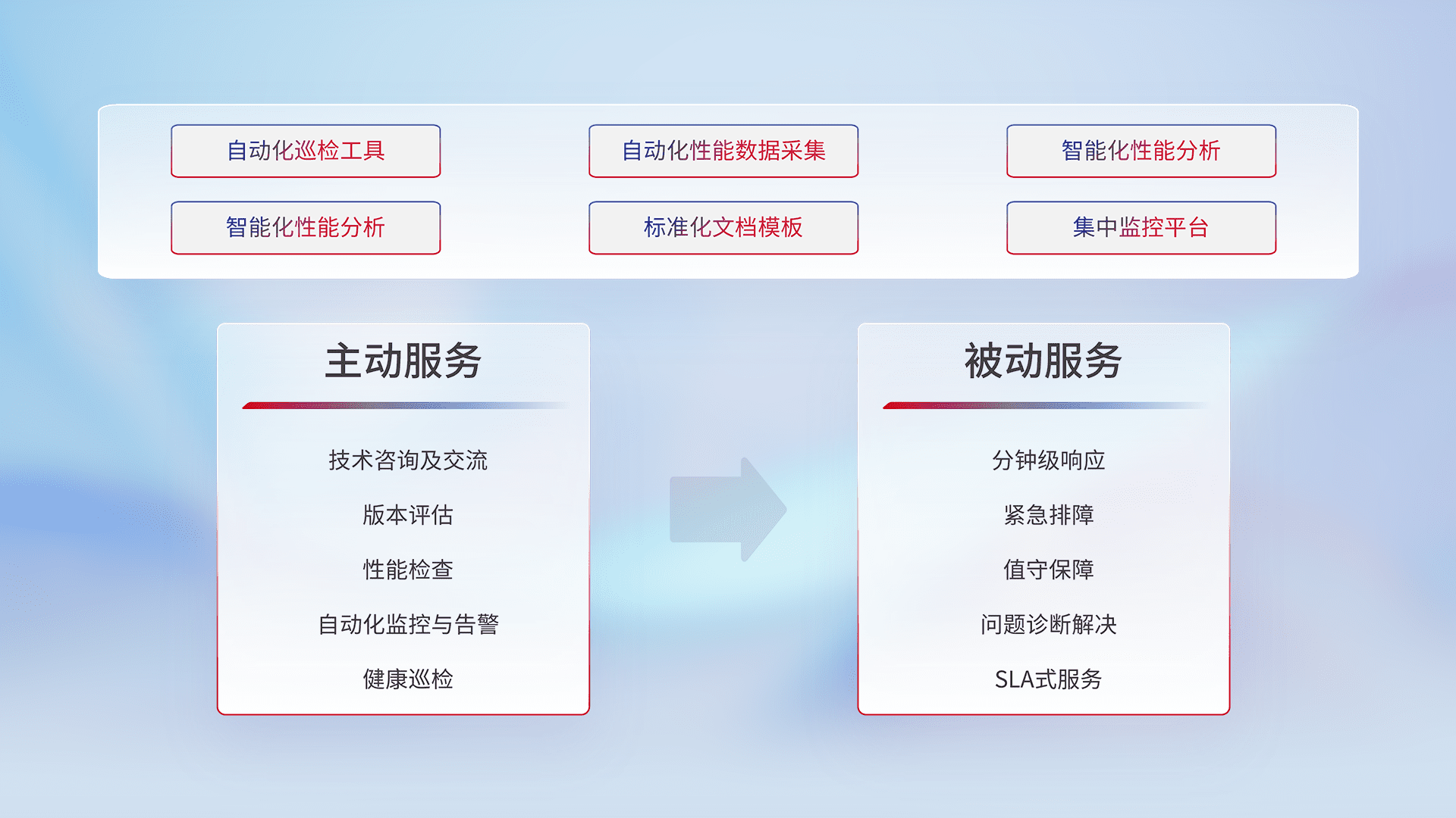智能化工具和标准化文档,,保障服务质量,,,提供主动服务(包含技术咨询、、、版本评估、、性能检查、、自动化监控与告警、、、健康巡检)和被动服务包含(分钟级响应、、、紧急排障、、、值守保障、、、、问题诊断解决、、SLA服务)。。。。