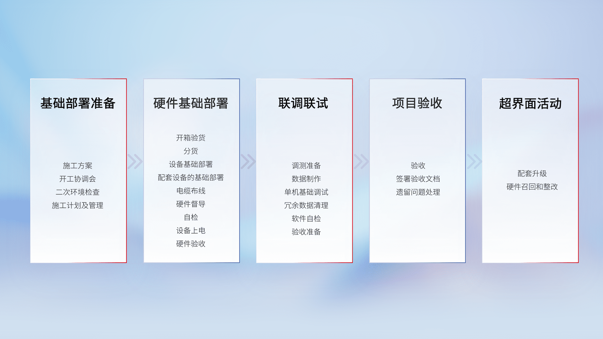 从基础部署准备、、、、硬件基础部署、、、联调联试、、项目验收、、、、越界面活动的全过程可追溯,,,,保证施工质量和进度。。。